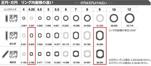 타원 링이라면, 1 사이즈상의 쇼오엔링과 동등 이상의 링 내면적이 있기 위해, 실대로가 좋음은, 동사이즈의 쇼오엔링보다 향상하는 것을 알 수 있었습니다.