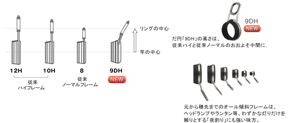 따라서 개발 해야 할 것은, 종래 가이드의8·10H·12H(을)를 원 사이즈로 커버할 수 있는 경사 프레임의 전 가이드.검증에 따르는 검증의 결과, 수처의 타원4.25같이, 전 가이드에도 신사이즈 「타원9」(을)를 설정했습니다.spool로부터 나온 실을 부드럽게 중간 가이드에 잇는 신형 하이 프레임 「9DH」의 베스트인 높이는, 바람으로 비듬 어렵고, 비록 비듬이라고 관련되어도 관련이 빠지기 쉽고, 비에서도 장대에의 베타 다해를 경감합니다.